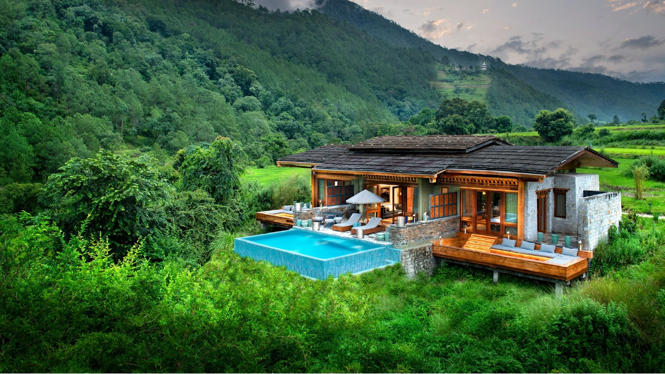- In Paro, private villas sit at the edge of whispering pine forests.